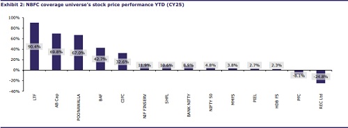 Non-banking lenders in our coverage should likely see broader Q1FY26 trends in growth, margins, asset quality, and credit cost continuing in Q2FY26. At an aggregate level, the divergence in growth between NBFCs and systemic credit will continue, as the superior origination capabilities of NBFCs continue to deliver. On the asset quality front, the continued stress in smaller-ticket loans has likely spilled over to Business Loans, Micro-LAP, and even vehicle loans (to an extent). This increase in stress is largely a customer segment phenomenon (rather than being related to any product segment), and a likely outcome of increased leverage in the customer segment. However, the comforting factor here is that the contribution of these smaller-ticket loans is much lower (low single digit percentage) for the diversified lenders in our coverage. Overall, we see a stable growth trend and slight increase in credit cost, leading to minor moderation in profitability. Following good monsoon, repo rate cuts, and GST cut-led demand impetus, we expect credit cost and profitability to improve in H2, with growth remaining healthy. On a risk-reward basis, we continue to like ABCAP and SHFL. After a material underperformance in YTDCY25, valuation has turned attractive for the power financiers (PFC and REC), and any pick-up in growth can drive outperformance for these shares.