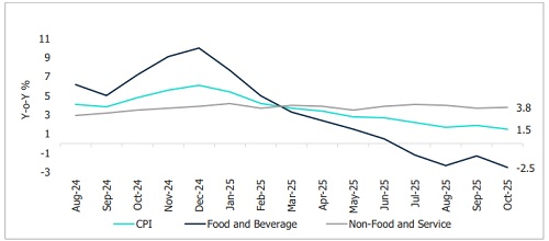 Nepal’s consumer price inflation eased to 1.5% year-on-year (y-o-y) in mid-October, down from 1.9% in midSeptember. The food and beverage category saw deeper deflation, with prices falling 2.5% y-o-y compared to 1.3% a month earlier. Meanwhile, inflation in the non-food and services category inched up slightly to 3.8% from 3.7%