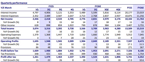 * We expect NIM to remain broadly stable. Upfront assignment income is estimated at ~INR485m.