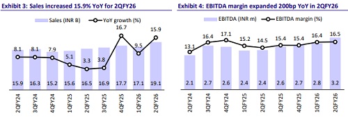 * For 1HFY26, revenue/EBITDA/PAT grew 13%/25%/18% YoY to INR36b/ INR6b/INR3.2b