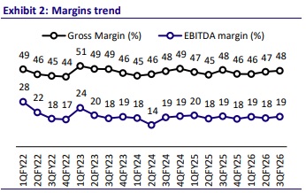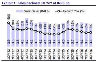 * In 3QFY26, revenue came in at INR3.5b (est. of INR3.7b), down 5%/9% YoY/QoQ, while gross margin stood at 48%, down 50bpsYoY and up 60bp QoQ.