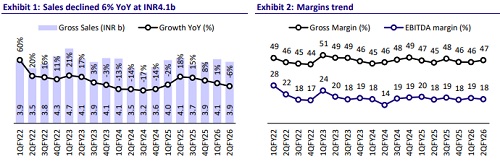* Revenue declined 6% YoY/4% QoQ to INR3.9b (est. INR4.2b), while gross margin expanded by 190bp YoY and 150bp QoQ to 47.3%.