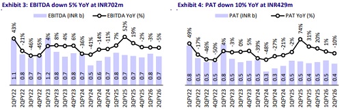 * EBITDA stood at INR702m, down 5% YoY and 8% QoQ (est. of INR776m).