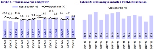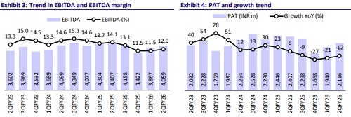 * 1HFY26 Revenue/EBITDA/PAT grew 7.5%/ -9.0%/ -16.4%, respectively, to INR67b/7.9b/4.1b, respectively. For the remainder of FY26, we expect each of these metrics to grow ~11%/8%/-5%, respectively, to INR68b/INR8.1b/INR3.7b.