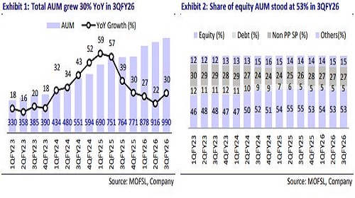 * Total AUM grew 30% YoY to INR990b, led by healthy inflows and an increase in the ticket size of clients. The share of equity MFs in the AUM mix was stable QoQ at 53%, with equity AUM market share rising to 1.46% in Dec’25 from 1.01% in Mar’19. Private Wealth/Digital Wealth AUM grew 30%/29% YoY to INR967b/INR24b.