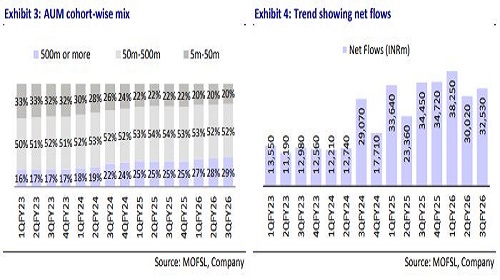 * Total quarterly net inflows/equity flows declined 6%/25% YoY to INR32.5b/INR20.4b. On a 9M basis, total/equity flows grew 10%/4% YoY. Equity inflows as a proportion of total stood at 63% vs. 79% in 3QFY25. The share of customers with AUM of INR500m+ has increased to 28.6% in 3QFY26 from 24.5% in 3QFY25. It onboarded 481 net new client families in 3Q, taking the total count to 13.3k families.