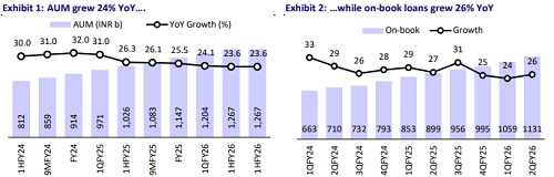 * AUM grew 24% YoY to ~INR1.3t, while disbursements rose ~33% YoY to ~INR159b. Total on-book loans grew ~26% YoY/7% QoQ to ~INR1.1t.