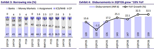 * Reported yields declined ~20bp QoQ to ~9.3% and CoB declined ~30bp to ~7.4%, leading to ~10bp QoQ rise in spreads to ~1.9%. Reported NIM in 2QFY26 was stable QoQ at ~4.0%.