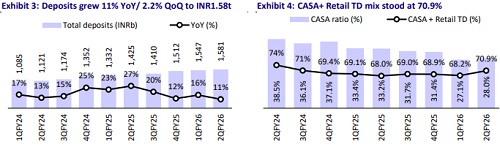 * Net advances grew 6.8% YoY (up 4.7% QoQ), while deposits grew 10.9% YoY (up 2.2% QoQ). The CASA mix, thus, improved slightly sequentially to 28%. The CD ratio stood at 85% vs 83% in 1QFY26.