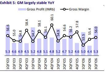 * For 9MFY26, revenue was flat, gross margin compressed 90bp to 54.9%, and EBITDA dipped 1% with margin at 20.7%. Reported PAT at INR1.32b declined 54% YoY and adj PAT at INR1.5b dipped 25% YoY.
