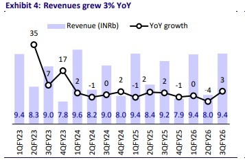 * Bata India reported a modest 3% revenue growth in 3QFY26 and its EBITDA margin expanded 73bp YoY to 22.4%, supported by tighter cost control and accounting changes.