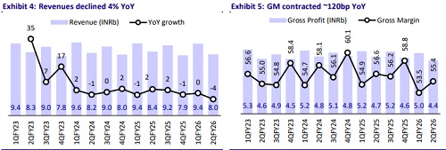 * Bata India’s (BATA) 2QFY26 revenue declined ~4% YoY, hurt by the deferment of purchases by channel partners and warehouse disruption.