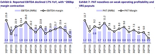 * 1HFY26 revenue declined 2% YoY, while pre-Ind AS EBITDA declined 28% to INR1.3b, with margins contracting to 7.5% (vs. 10.2% YoY), despite accounting changes that would have otherwise raised reported profitability.