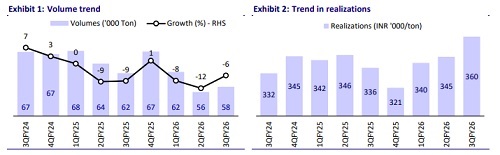 * Standalone revenue was flat YoY at INR20.8b (largely in line with estimates). Volumes in 3Q declined 6% YoY to 57,859MT, while realizations grew 7% YoY to INR360/kg, driven by a higher non-auto mix.