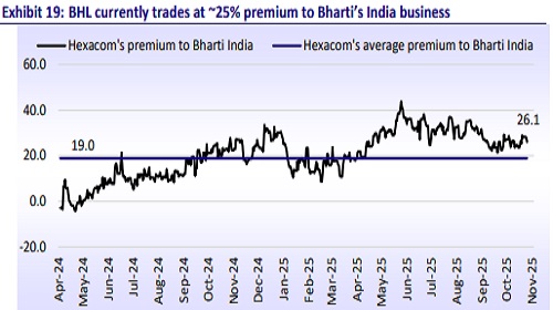 * However, since its listing, the stock has re-rated significantly and now trades at ~17.5x one-year forward EV/EBITDA (~25% premium to Bharti’s India business (ex-Indus). We believe such a sharp premium is unjustified.