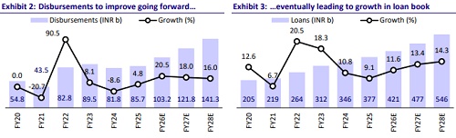 * CANF anticipates monthly disbursements to cross INR1b in Telangana, recovering from the low base of INR700m earlier. With momentum likely to strengthen in 2HFY26, the company has guided for disbursement growth of ~20% in FY26. This recovery will be underpinned by contributions from newly opened branches, a stronger sales team, and improved housing activity in its core southern markets. We estimate CANF to deliver an AUM CAGR of 13% and disbursement CAGR of ~18% over FY25-28.