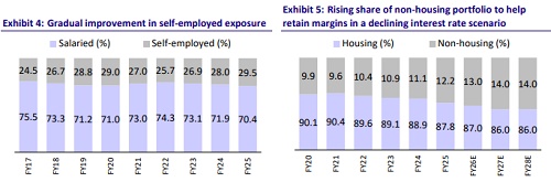 * CANF’s NIM is expected to improve in the near term, supported by declining borrowing costs, portfolio mix optimization, and a lag in passing on lower CoB to the customers. The company aims to increase the share of higher-yielding nonhousing loans to ~20% by FY28 (from 11% in FY23), alongside a higher proportion of self-employed non-professional (SENP) borrowers.