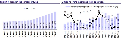 * Annual issuer charges rose 42% YoY to INR 1.2b, driven by a sharp increase in the number of unlisted companies issued (3,593 in 2QFY26). The total includes a one-time application fee of INR53.9m and unlisted issuer charges of INR35.3m. The market share stood at 30-32%.