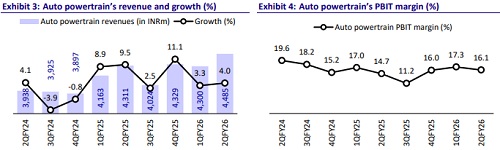 * Aluminum business should remain a key growth driver going forward on the back of a ramp-up of its alloy wheel facilities in Bhiwadi and Hosur, steady order visibility from both domestic and export customers, and benefits of restructuring of Sunbeam to be visible from FY27E. However, powertrain margins are likely to remain under pressure at least in the near term as Craftsman looks to develop products for data center applications, which are significantly high-gestation projects (3-4 years for SOP). After the recent run-up in the stock, most of the positives seem factored in at 42.7x FY26E and at 29.1x FY27E consolidated EPS. We maintain Neutral with a TP of INR6,542 (valued at 24x Sep’27E EPS).