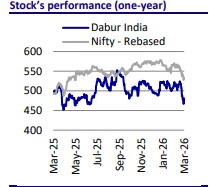 * Domestic FMCG growth stood at 6% in 3QFY26, which management expects to improve ahead. Encouragingly, as per Dabur, the first 10 days of March have not shown any material slowdown in consumer demand.