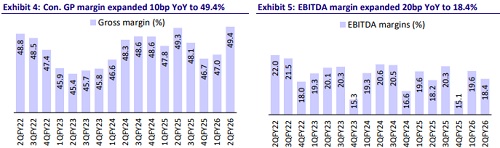 * GM expanded 10bp YoY to 49.4% (est. 48.8%), and EBITDA margin rose 20bp YoY to 18.4% (est: 18.3%). EBITDA grew 6% despite a favorable base (-16% in 2QFY25). Management highlighted that there was ~8% inflation during the quarter, which was mitigated by price hikes of ~4% and costsaving initiatives.