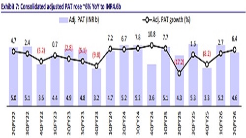 * Mid-single digit revenue growth: Dabur’s 2QFY26 consolidated sales grew by 5.4% (inline) to INR31.9b (est. INR32.1b). Indian business revenue grew by 5.7% YoY. Indian business volume growth stood at 2%. (est. 6%).