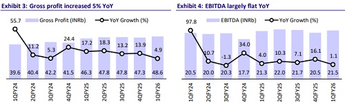 * EBITDA was largely stable YoY at INR21.5b (est. of INR19.1b). Income from the innovative product segment was higher at INR1.6b in 1Q vs. INR1.5b in FY25. Adj. for this income, EBITDA would be INR20.3b for the quarter. R&D spend was lower at 7.3% of sales in 1Q vs. 8.4% in FY25.