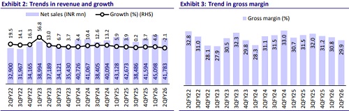 * Standalone revenue declined 2% YoY to INR41.8b (6% below our estimate), due to production cuts in Aug and Sep on the back of channel destocking done by distributors after the GST 2.0 announcement in mid-Aug.
