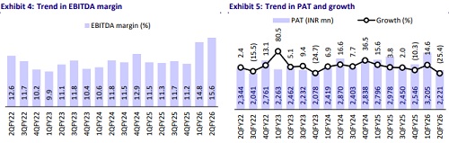* EXID's 2QFY26 PAT of INR2.2b came in well below our estimate of INR3.2b on account of lower-than-expected revenue. Revenue was mainly affected by channel destocking in segments like auto replacement, UPS and solar and weak demand in home UPS due to extended monsoon. Management expects the bulk of this demand to revive in 2H as the channel would look to restock and OEM demand is picking up.