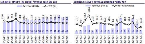* HAVL’s consolidated revenue/EBITDA/PAT stood at INR47.8b/INR4.4b/INR3.2b (+5%/+17%/+19% YoY and in line vs. our estimates). Gross margin stood at ~35% (+1.2pp YoY). OPM expanded 90bp YoY to ~9.2%. OPM (Ex-Llyod) stood at ~12.2% (up 2.3pp YOY; 1.2pp above estimates). Ad spends stood at 2.8% of revenue vs. 2.9%/2.6% 2QFY25/1QFY26.