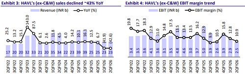 * HAVL’s 2QFY26 performance was in line with our estimates, as weakness in Lloyd offset the strong performance of other segments. We believe demand momentum after the GST reduction will be a key monitorable for the near term, along with a reduction in channel inventory.