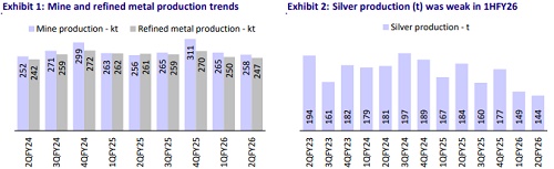 * The company revised the refined metal guidance to 1,075–1,000ktpa and silver output to 680t (±10t) for FY26, adjusting for plant availability and input performance in 1HFY26.