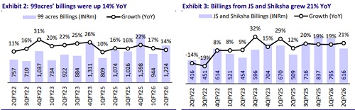 * 99acres sustained its growth momentum, supported by higher customer additions and better realization per customer. We note that broker and channel partner billings grew faster than developer billings, while traffic share improved to ~49% vs. mid-20s for peers. We think the platform’s continued investments in marketing and AI-driven matching tools may weigh on near-term profitability but should further strengthen its market leadership. We expect the recent traffic share gains to start translating into billings over the next 3-4 quarters.