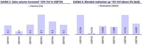 * Consolidated revenue/EBITDA stood at INR14.4b/INR2.7b (up 17%/65% YoY and up ~7%/40% vs. estimates). Net profit stood at INR864m (115% above estimates) vs. a loss of INR368m in 2QFY25. Sales volume increased 15% YoY to 3.1mt (+7% vs. our estimates). Of this, cement volume stood at 1.7mt (up 7% YoY) and GGBS was at 1.4mt (21% YoY). Blended realization/t was up 2% YoY (down 2% QoQ) at INR4,619/t (in line).