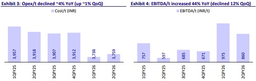 * Opex/t declined ~4% YoY (~5% below our estimate), driven by a ~5%/1% YoY decline in variable/freight cost per ton. Other expenses/t remained flat YoY. Employee cost/t declined ~17% YoY. EBITDA/t surged ~44% YoY to INR860.