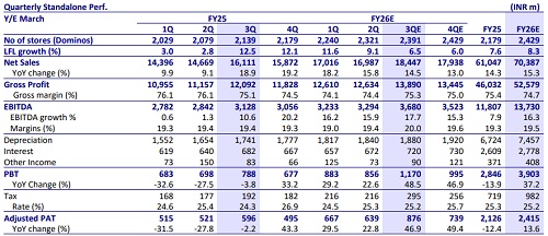 * JUBI revenue growth expected to moderate to 14% YoY (19% in 2HFY25 and 17% in 1HFY26) due to high base. We model ~6.5% LFL growth.
