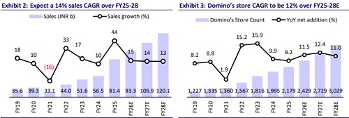 * The company remains focused on driving cost efficiencies across procurement and operations to support profitability. It aspires to deliver over 200bp expansion in standalone pre-IND-AS EBITDA margins over the next three years, driven by lower losses of new ventures (~200bp impact), better GM of Domino’s, and cost efficiencies. While simultaneously pursuing aggressive expansion plans with a target of opening 1,000 new stores by FY28.