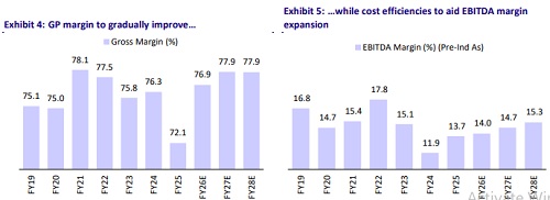 * Over the medium term, management is targeting 5-6% LFL growth per store, with 1-2% expected from pricing and the balance to be driven by volume and mix improvements. Store growth will be ~10%, which will aid ~8% revenue growth every year. Thus, the domestic business can deliver 13-15% sustainable growth over the medium term. We model a 15% revenue CAGR over FY25-28E.