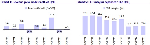 * L&T Technology’s (LTTS) 2QFY26 revenue grew 1.3% QoQ in CC terms vs. our estimate of 1.0% QoQ growth. Sustainability grew 3.0% QoQ, while Mobility declined 1.4% QoQ.