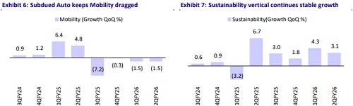* Mobility to stabilize in 4Q; sustainability segment leads growth: LTTS reported a stable 2QFY26, largely driven by growth in the sustainability segment (up 3.1% QoQ). Mobility still remains weak, dragged by subdued auto demand. Trucks and off-highway sub-segments provided some relief. Management expects Auto to witness an improvement from 4Q onwards. Hi-tech remains a mixed bag. While the Intelliswift integration is supporting growth, ramp-ups in med-tech in the US have experienced some deferrals.