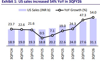 ? US sales grew 54% YoY to INR31.1b (up 46% YoY in CC to USD350m; 44% of sales).