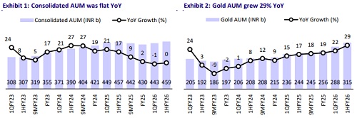 * Consol. total AUM rose ~4% QoQ and was flat YoY. Consol. Gold AUM grew ~9% QoQ and ~29% YoY to ~INR315b.
