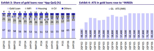 * Gold AUM grew ~9% QoQ and ~29% YoY to ~INR315b. Gold tonnage rose ~1% QoQ to ~57.2 tons. Within gold loans, LTV was stable QoQ at ~56% and the average ticket size (ATS) rose to INR83k (PQ: INR76k). Gold loan customer base was broadly stable at ~2.6m.