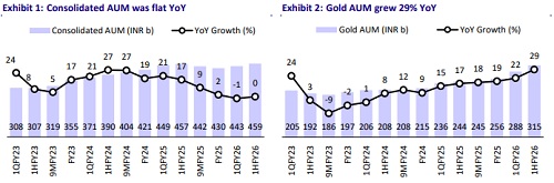 * Consol. total AUM rose ~4% QoQ and was flat YoY. Consol. Gold AUM grew ~9% QoQ and ~29% YoY to ~INR315b.