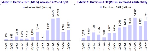 * In 1HFY26, NACL’s revenue stood at INR81b (+18% YoY), primarily led by a strong increase in aluminum prices and alumina volume, which largely offset the adverse impact of muted alumina prices.