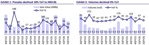 * Volumes were down 9% YoY / 29% QoQ to 0.25msf (16% below estimates). In 1HFY26, volumes stood at 0.6msf, up 24% YoY.