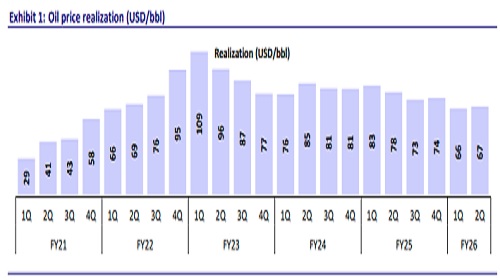* ONGC’s 2QFY26 revenue came in line with our est. at INR330b. Crude oil/gas sales were in line with our est. at 4.8mmt/3.9bcm. VAP sales stood at 592tmt (est. 681.5tmt). Reported oil realization was USD67.3/bbl, a USD3.2/bbl discount to Brent in 2Q. EBITDAX/PAT also stood in line with our est. at INR177b/INR98.5b.