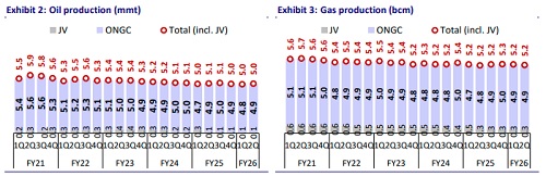 * We arrive at our SoTP-based TP of INR250 as we model a CAGR of 2%/3% in oil/gas production volume growth over FY25-27.