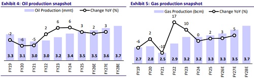 * For FY26, standalone production is guided at 3.55mmt of oil and 3.6bcm of gas, indicating a marginal reduction vs. the previous guidance. For FY27/28, guidance is maintained at 3.8/4mmt of oil and 3.8/4.6bcm of gas. However, in the past few quarters, ONGC has struggled to raise production/sales, with marginal YoY production/sales growth in 1HFY26. Hence, we build in a CAGR of 2.7%/4.2% in OINL’s standalone oil/gas production over FY25-28, reaching 3.7mmt/3.7bcm in FY28.