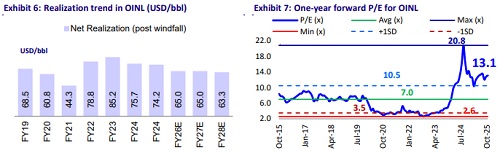 * Following continued exploratory well write-offs, we cut our FY26/27 SA EPS for OINL by 8%/9%. On our revised estimates, OINL will report SA PAT CAGR of -12% over FY25-28. Given a sluggish earnings outlook, we maintain our PE multiple at 6x on Dec’27E EPS. We maintain our SoTP-based TP of INR400 as we model a 2.7%/4.2% production volume CAGR for oil/gas over FY25-28.